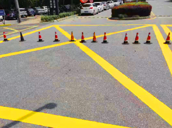 热熔形式的道路交通标线,一般线宽采用15公分,使用热熔釜加热融化热熔标线材料,用热熔划线机划线。